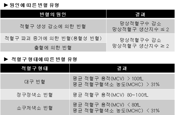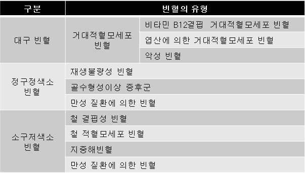 빈혈은 조직에 산소를 공급하는 혈액이 인체조직의 대사에 필요한 산소를 충분히 공급하지 못해 조직의 저산소증을 초래하는 것을 말합니다. 빈혈은 적혈구 형태에 따라, 원인에 따라 많은 종류로 분류됩니다.